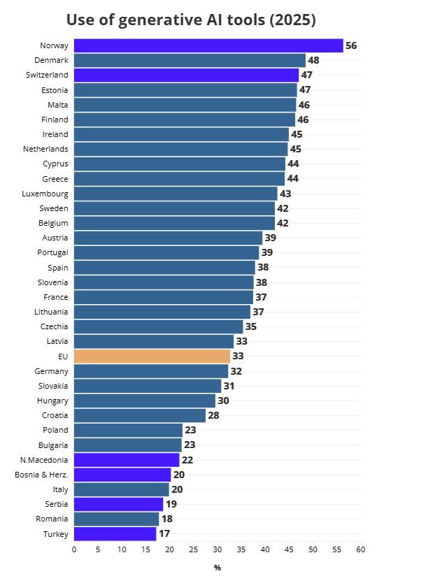Η υιοθέτηση ποικίλλει σημαντικά σε ολόκληρη την ήπειρο. Η Νορβηγία ηγείται με το 56% του πληθυσμού να χρησιμοποιεί τεχνητή νοημοσύνη, ενώ η Τουρκία καταγράφει μόνο 17%.