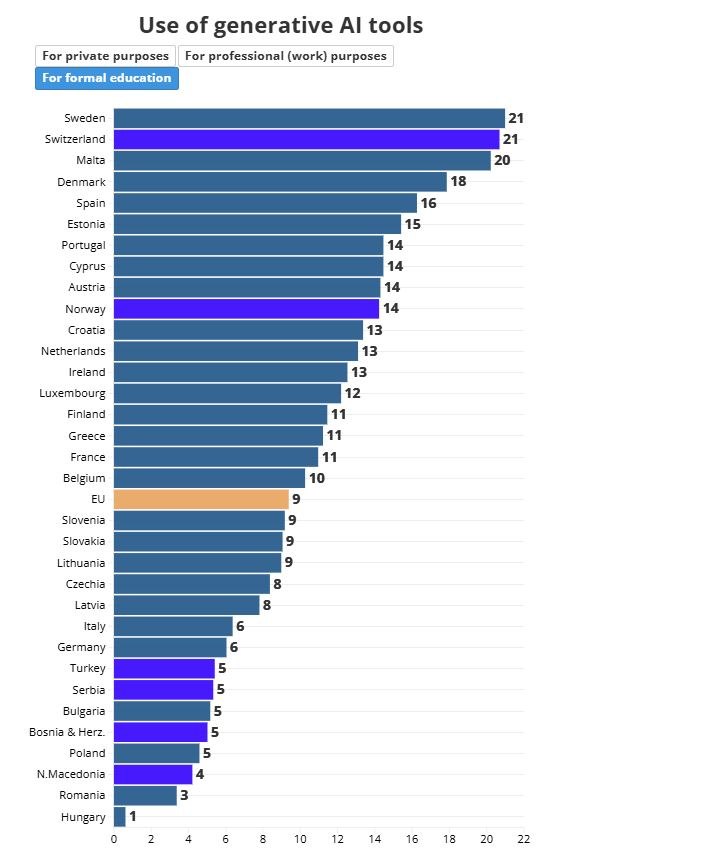 Στην ΕΕ, μόνο το 9% των ανθρώπων χρησιμοποίησε εργαλεία Τεχνητής Νοημοσύνης για την επίσημη εκπαίδευση. Αυτό το ποσοστό είναι υψηλότερο στη Σουηδία και την Ελβετία, και οι δύο με 21%, ενώ η Ουγγαρία καταγράφει το χαμηλότερο ποσοστό με μόλις 1%.
