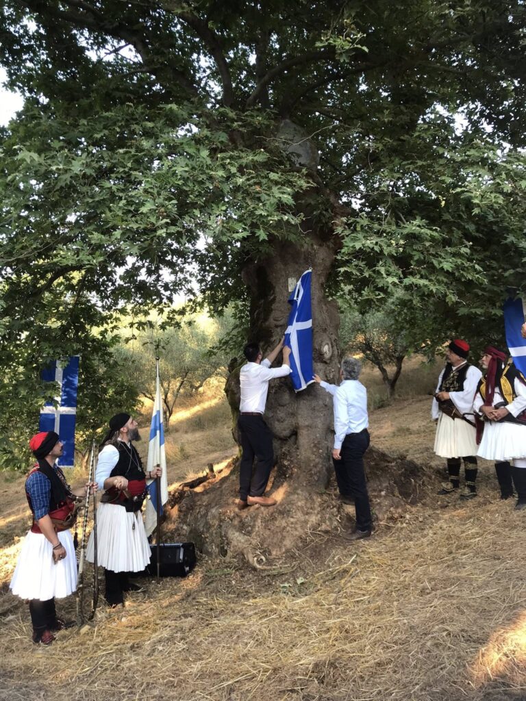 Εν συνεχεία, έγιναν τα αποκαλυπτήρια της επετειακής ετικέτας σήμανσης του μνημειακού πλατάνου από τον κ. Κων/νο Κατσέπα (στην ιδιοκτησία του οποίου βρίσκεται το δέντρο) και τον Δρ. Παναγιώτη Λάττα, δασάρχη Πύργου. Ακολούθως, έγινε κατάθεση στεφάνων από τον Διοικητή του Α.Τ Αρχαίας Ολυμπίας κ. Ι. Λινάρδο, από τον δασάρχη κ. Π. Λάττα, την εκπρόσωπο του Πατριωτικού Ομίλου Απογόνων Ηρώων 1821 κ. Β. Μπερτσάτου και τον εκπρόσωπο της οικογένειας Κατσέπα – Μπαρλαμά κ. Κ. Κατσέπα ενώ τέλος, οι παρευρισκόμενοι έψαλαν τον Εθνικό Ύμνο. Επίσης, την εκδήλωση τίμησαν με την παρουσία τους ο Σύλλογος Φίλων Ιστορίας «Χαράλαμπος Βιλαέτης», που με τις παραδοσιακές του φορεσιές αναβίωσε εικόνες της Ελληνικής Επανάστασης, κλιμάκιο του Αστυνομικού Τμήματος Αρχαίας Ολυμπίας καθώς και πλήθος κόσμου. Αξίζει να σημειωθεί ότι το σχέδιο της ετικέτας του Δικτύου έχει φιλοτεχνηθεί από την ομογενή ζωγράφο Joanna Kordos, ενώ φέρει το σήμα της Επιτροπής «Ελλάδα 2021» καθώς το εν λόγω έργο τελούσε υπό την αιγίδα της.