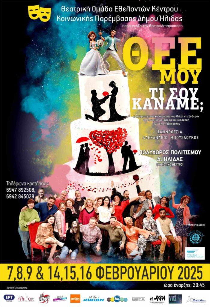 Με την επιτυχημένη περσινή τους παράσταση, την διάσημη κινηματογραφική κωμωδία του Φιλίπ Ντε Σοβερόν, «Θεέ μου τι σου κάναμε;» κάνει φέτος ένα δεύτερο δυνατό come back η θεατρική ομάδα Αμαλιάδας «Παρεμβάσεις» των Εθελοντών Κέντρου Κοινωνικής Παρέμβασης δήμου Ήλιδας, σε διασκευή του Λάκη Λαζόπουλου σε σκηνοθεσία του Αλέξανδρου Μπουσδούκου. Πρόκειται για μια ευφυή και εύστοχη αντιρατσιστική κωμωδία, όπου ένα τυπικό ελληνικό ζευγάρι προσπαθεί να συμφιλιωθεί με την ιδέα ότι έχει γαμπρούς αλλόφυλους. Η παράσταση στην περσινή θεατρική σεζόν του 2024 είχε αφήσει τις καλύτερες εντυπώσεις με κατάμεστη από κόσμο αίθουσα στον Πολυχώρο της Αμαλιάδας και έτσι η ομάδα αποφάσισε να την επαναλάβει για το θεατρόφιλο κοινό.