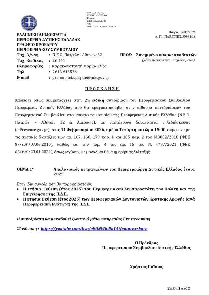 Την Τετάρτη 11 Φεβρουαρίου 2025 και ώρα 15:00, στην αίθουσα συνεδριάσεων του Περιφερειακού Συμβουλίου (Ν.Ε.Ο. Πατρών – Αθηνών 32 & Αμερικής), θα πραγματοποιηθεί η 2η ειδική συνεδρίαση του Περιφερειακού Συμβουλίου Δυτικής Ελλάδας, με μοναδικό θέμα τον απολογισμό πεπραγμένων του Περιφερειάρχη Δυτικής Ελλάδας, Νεκτάριου Φαρμάκη, για το έτος 2025.