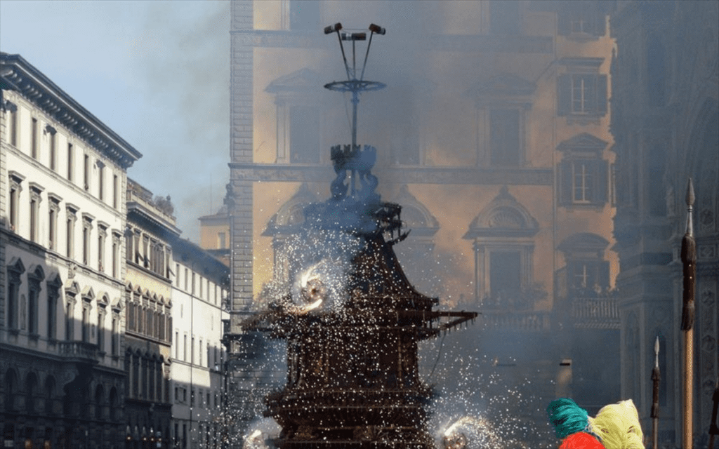 Στη Φλωρεντία, το Πάσχα είναι συνώνυμο με τον θόρυβο και τα πυροτεχνήματα. Ένα παλιό κάρο γεμάτο πυροτεχνήματα σέρνεται στους δρόμους από λευκά βόδια και στον καθεδρικό ναό, ο Αρχιεπίσκοπος ανάβει το φυτίλι σε σχήμα περιστεριού, δημιουργώντας ένα εκθαμβωτικό θέαμα που ονομάζεται Scoppio del Carro (Έκρηξη του Κάρου).