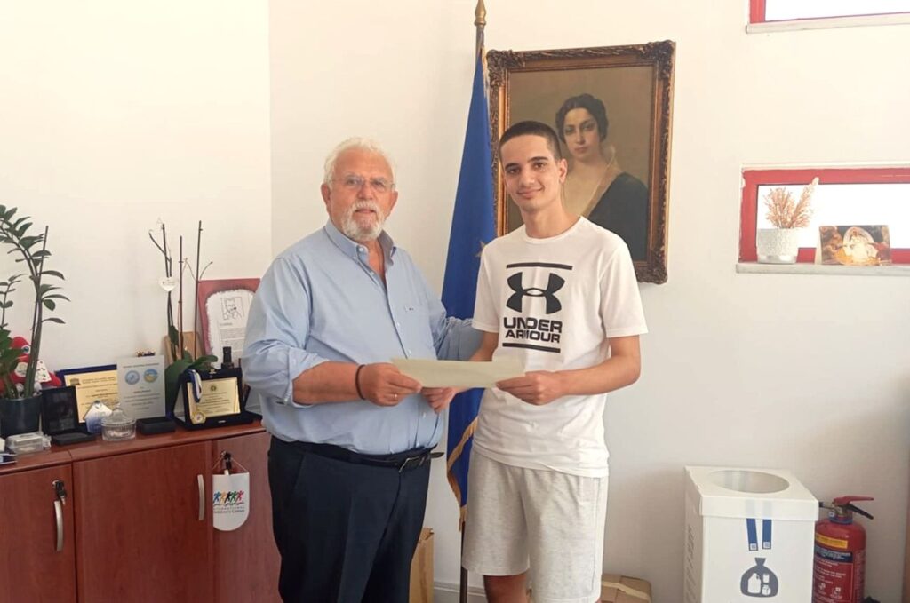 Κατά τη συνάντησή τους, ο Δήμαρχος Ήλιδας παρέδωσε τον τιμητικό έπαινο του Δήμου Ήλιδας στον μέχρι πρόσφατα μαθητή του 2ου Γενικού Λυκείου Αμαλιάδας, αναγνωρίζοντας την προσπάθεια και το ήθος του.