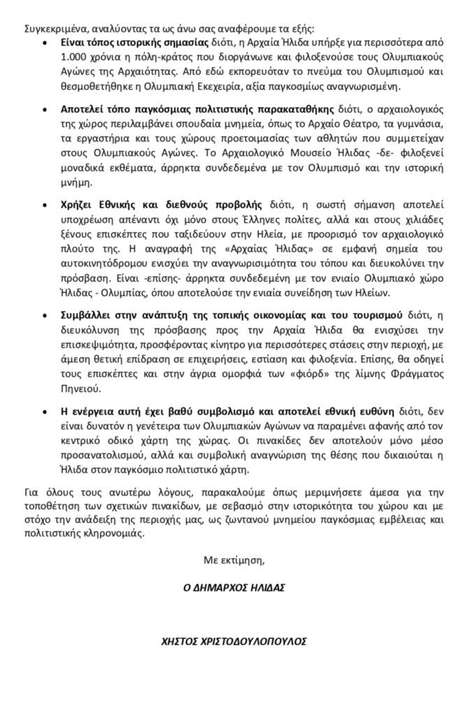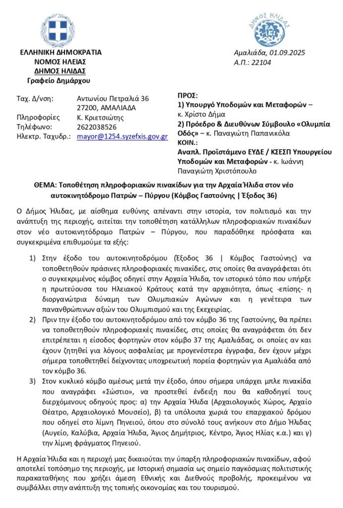 Για την επίτευξη αυτού, ο Δήμος Ήλιδας είχε αποστείλει επίσημο έγγραφο προς τον Υπουργό Υποδομών & Μεταφορών κ. Χρίστο Δήμα, και τον πρόεδρο της «Ολυμπίας Οδού», ήδη από την 1η Σεπτεμβρίου 2025, όπου τονιζόταν η ανάγκη ανάδειξης της Αρχαίας Ήλιδας ως σημείου εθνικής και διεθνούς προβολής.