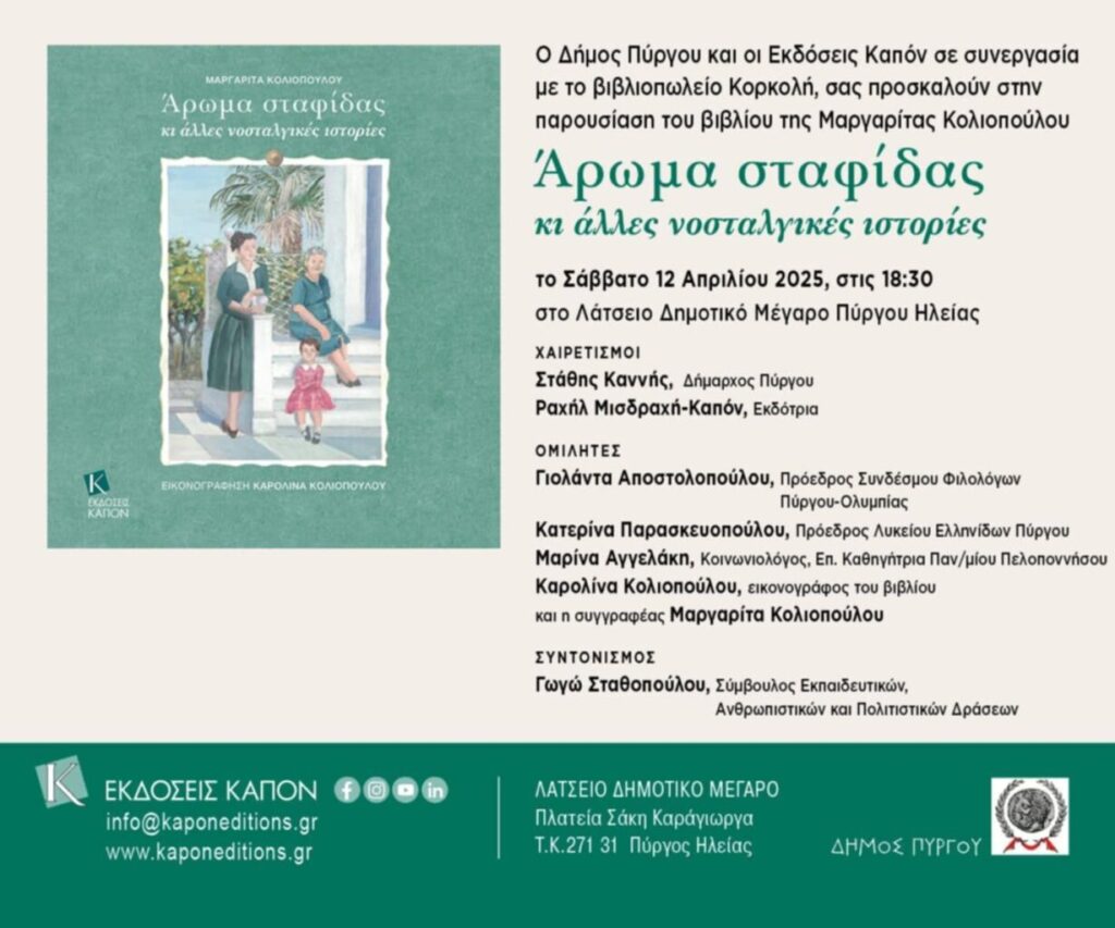 Το βιβλίο της Πυργιώτισσας Μαργαρίτας Κολιοπούλου «Άρωμα σταφίδας και άλλες ιστορίες», πρόκειται να παρουσιάσουν στο Λάτσειο Δημοτικό Μέγαρο Πύργου, το Σάββατο 12 Απριλίου, στις 6.30 το απόγευμα, ο δήμος Πύργου και οι εκδόσεις Καπόν, σε συνεργασία με το βιβλιοπωλείο ΚΟΡΚΟΛΗ.
