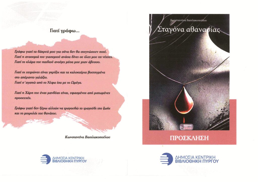 Το δεύτερο βιβλίο ποίησης «Σταγόνα Αθανασίας» της Πύργιας ποιήτριας Κωνσταντίνας Βασιλακοπούλου παρουσιάζει η Δημόσια Κεντρική Βιβλιοθήκη Πύργου, το Σάββατο 29 Νοεμβρίου 2025 στις 7 μ.μ. στην αίθουσα εκδηλώσεών της.
