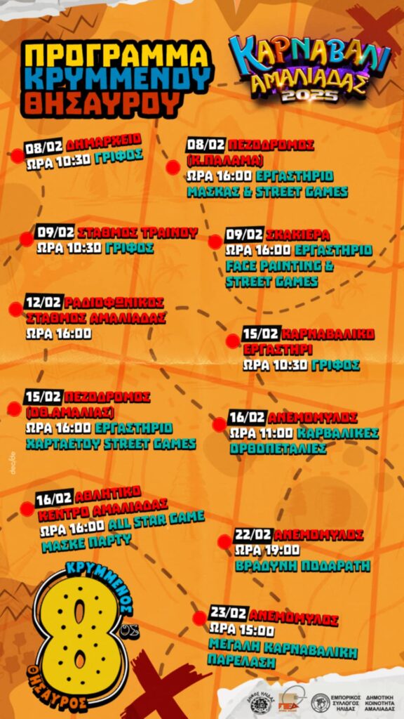 Το πλήρως ανανεωμένο Παιχνίδι του «Κρυμμένου Θησαυρού», το οποίο εντάσσεται στο πρόγραμμα εκδηλώσεων του θεσμού «Καρναβάλι Αμαλιάδας 2025», ξεκινάει το ερχόμενο Σαββατοκύριακο. Η αρχή θα γίνει στις 10:30 το πρωί του Σαββάτου 8 Φεβρουαρίου 2025 στο Συνεδριακό Κέντρο Αμαλιάδας (κτίριο Σοχιάς), όπου οι εκπρόσωποι των γκρουπ, αλλά και ανεξάρτητες ομάδες παιδιών και καρναβαλιστών θα λάβουν την αποστολή τους και τους πρώτους ευφάνταστους γρίφους που καλούνται να επιλύσουν.